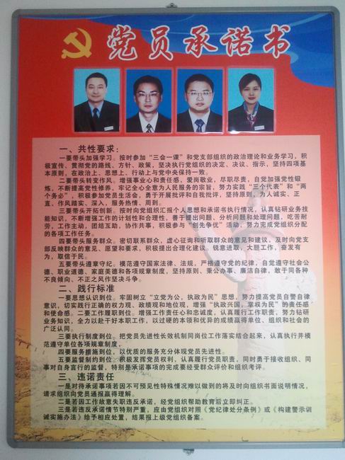 全體黨員結(jié)合各自崗位實際,踴躍表態(tài),簽訂了《黨員承諾書》,主動接受群眾監(jiān)督。承諾書緊緊圍繞“推動科學(xué)發(fā)展、促進社會和諧、服務(wù)人民群眾、加強基層組織”和“五要”的要求,通過制定黨員標(biāo)準(zhǔn)、設(shè)置黨員示范崗、群眾監(jiān)督、動態(tài)管理四種形式,不斷提升黨員政治素質(zhì),帶頭服務(wù)群眾,切實提高黨員服務(wù)科學(xué)發(fā)展的自覺性和責(zé)任感,推動活動向縱深開展。