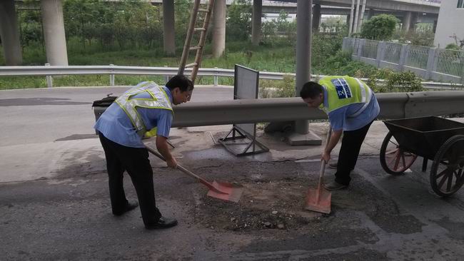 7月18日上午,諶家磯服務(wù)站“學(xué)雷鋒”青年志愿者們帶上鋤頭和鐵鏟,借了手推車拉來兩車細沙和石子,將站區(qū)坑凼填平。近期,由于重載車輛碾壓和暴雨沖刷等原因,使諶家磯服務(wù)站收費現(xiàn)場和周邊道路坑坑洼洼,最深的坑有30厘米,里面還有不少積水,過往車輛途經(jīng)這里都避免不了要狠狠地顛一下。
