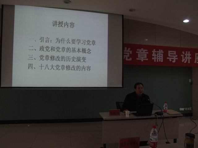 講座中,王校長用豐富的理論、精辟的語言,圍繞“自覺學(xué)習(xí)黨章,加強(qiáng)黨性修養(yǎng)”這一主題,聯(lián)系實(shí)際深入淺出地闡述地廣大黨員干部為什么要學(xué)習(xí)黨章、黨章的基本內(nèi)容及黨章修改的歷史,并對十八大對黨章的修改內(nèi)容進(jìn)行了逐條對比解析。學(xué)習(xí)人員用心聆聽,專心筆記。講座結(jié)束后,組織了學(xué)習(xí)新黨章和時(shí)事政治答題活動(dòng)。