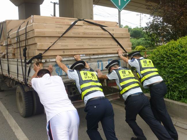 日前,稽查五中隊十五分隊在三環(huán)線長豐橋開展聯(lián)合執(zhí)法工作時,發(fā)現(xiàn)一輛滿載貨車停在百威立交橋附近,車旁的貨車司機愁眉不展地一邊打求援電話,一邊揮手攔截過往車輛。見狀,稽查隊員主動上前詢問,獲知該車因高溫拋錨無法啟動,眼看交貨時間就要到了,車主焦急萬分,不知所措。在場的稽查隊員聽聞此情況后,立即幫助貨車司機推動起沉重的故障車。正值烈日當空,炎陽炙人的時分,推車的隊員們已汗如雨下,全身濕透,可他們顧不上擦一把汗,全力以赴地幫助司機重新啟動貨車。當貨車的發(fā)動機再次響起轟鳴聲時,該車司機連聲向稽查隊員表達感激之情,同時送上煙和飲料以示謝意,但被隊員們一一婉絕。