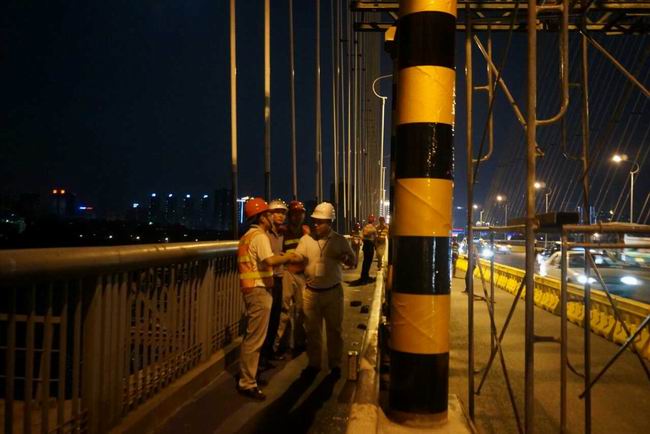 在長江二橋慰問現(xiàn)場,中心領導察看了工程項目部、職工生活區(qū)和橋梁施工現(xiàn)場,并與施工人員進行親切交談,詳細詢問了目前工程進度情況,對他們?yōu)殚L江二橋維修工程建設而舍小家顧大家所做出的貢獻給予贊賞,鼓勵他們繼續(xù)發(fā)揚頑強拼搏、艱苦奮斗的精神,團結一心、迎難而上,圓滿完成維修工程建設任務。