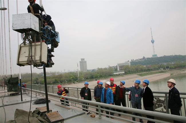檢查人員沿線查看了晴川橋全橋防腐涂裝、吊桿纏包帶更換等項(xiàng)目施工,聽取了業(yè)主項(xiàng)目部、施工單位、監(jiān)理單位關(guān)于工程推進(jìn)情況的匯報(bào)。鄧耀光主任在充分肯定工程施工質(zhì)量和現(xiàn)場(chǎng)安全文明施工的同時(shí),強(qiáng)調(diào)晴川橋是我市地標(biāo)性建筑,此次施工是在不封閉交通的情況下進(jìn)行,參建單位在施工中務(wù)必采取科學(xué)的措施方案,實(shí)行精細(xì)化管理,在確保施工質(zhì)量和施工安全的同時(shí),要密切關(guān)注天氣變化,合理安排工程進(jìn)度,爭(zhēng)取在5月底之前竣工。