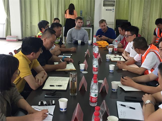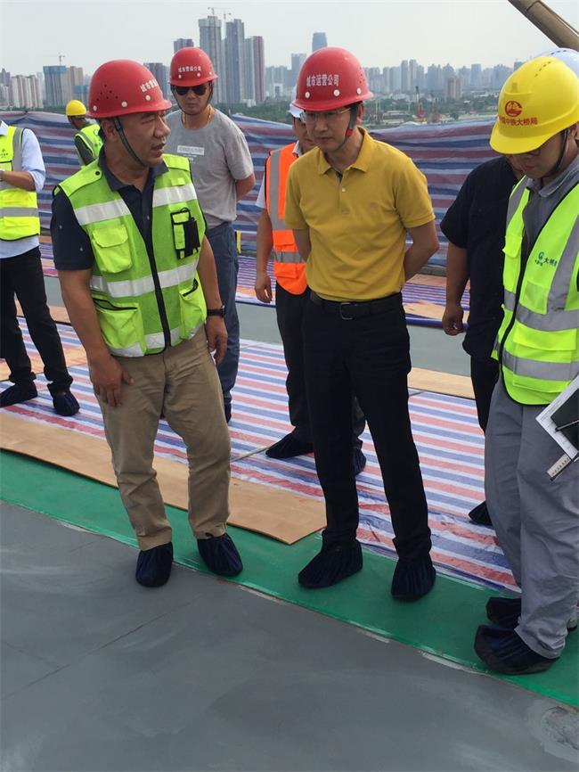 在天興洲長江大橋上,鄧董事長一行按照規(guī)范穿戴鞋套,依次進入施工區(qū)域,現(xiàn)場檢查了環(huán)氧瀝青鋪設的工藝保護設施安裝、鋪設設備、粘合劑涂裝等工作準備情況,并就環(huán)氧瀝青鋪設的實驗檢測、瀝青拌合運輸、施工養(yǎng)護作業(yè)等情況詢問了相關負責人。現(xiàn)場檢查完畢后,鄧董事長聽取了項目實施進展、計劃安排、施工監(jiān)理等情況的匯報,并就環(huán)氧瀝青鋪設的技術、施工要求等與外國專家進行了溝通。