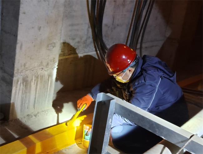 2月5日,江南泵站技術(shù)維修人員發(fā)揮自主維保技術(shù)力量,深入到循環(huán)水池底部有限空間,趟在淤水中對循環(huán)水泵電源電纜、接口耦合、升降鎖鏈的功能運作情況進(jìn)行檢測修復(fù)及清污除銹;躬身蹲在昏暗狹窄的變電站負(fù)一層對止水溝擋水沿涂刷防水漆進(jìn)行防水措施加固;協(xié)助維保單位在初春寒雨連綿的泵站外江消力池,對拍門進(jìn)行打磨、除銹,清污、噴漆、緊固螺栓及更換密封條等檢修維保處理。如火如荼的檢修維保工作現(xiàn)場,延續(xù)了江南泵站職工停機(jī)不停工的拼搏奮進(jìn)精神。