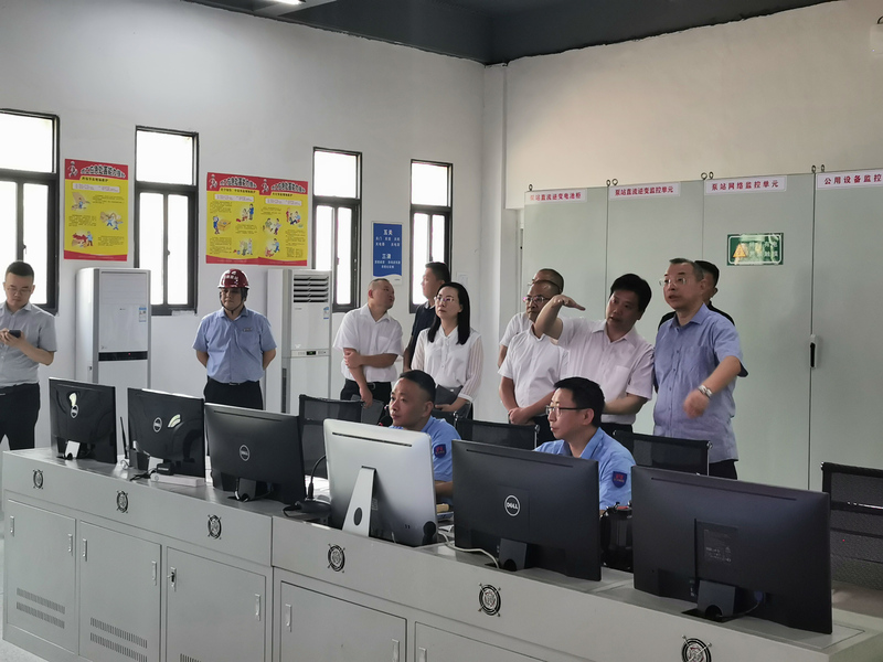 黃峰總經(jīng)理一行先來到了江南泵站泵房車間,了解了泵站服務(wù)水系、抽排范圍和機(jī)組運(yùn)行情況,到車間中控室、變電站監(jiān)控室參觀設(shè)備運(yùn)行監(jiān)控?cái)?shù)據(jù)、參數(shù)及設(shè)備運(yùn)行狀況,聽取了江南泵站有關(guān)生產(chǎn)運(yùn)行、抽排調(diào)度、機(jī)組設(shè)備工作原理、前池水位控制等情況。