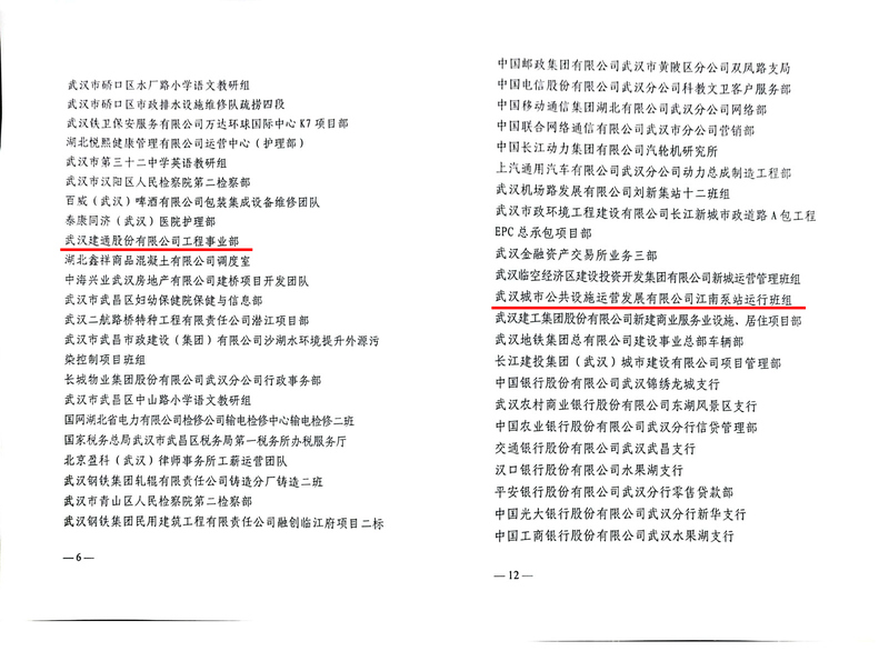 近日,從武漢市總工會(huì)獲悉,武漢城市公共設(shè)施運(yùn)營發(fā)展有限公司江南泵站運(yùn)行班組、武漢建通股份有限公司工程事業(yè)部榮獲武漢市2021年度勞動(dòng)生產(chǎn)優(yōu)秀班組,同時(shí)選樹為武漢市工人先鋒號榮譽(yù)稱號。