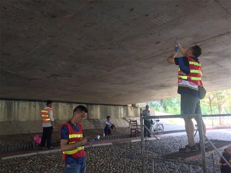 在這次檢測中,工作環(huán)境最為惡劣的是孝感市體育西路橋。體育西路橋跨越體育西路后湖渠,由于后湖渠嚴重污染,導致水體嚴重變質(zhì),發(fā)出陣陣惡臭味,而且梁底板距離水面距離很小,檢測人員操作面較為狹窄,但是為了完成下部結(jié)構(gòu)的檢測工作,檢測人員頂著惡臭,在狹窄空間內(nèi)連續(xù)工作2小時,完成下部結(jié)構(gòu)檢測工作。兩小時后,他們身上濕透了,脫掉衣服都可以擰出水來,但是他們并沒有抱怨,而是為完成本項檢測工作露出了開心的笑容。