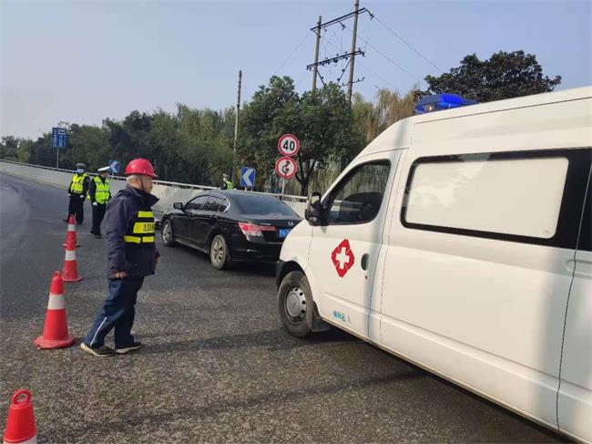 9點30分,江城氣溫較低,天氣比較寒冷,長江二橋楊園匝道發(fā)生了一起交通事故,一個騎摩托車的車主不慎重重地摔倒在道路上。險情就是命令,當班管護隊員火速趕到現(xiàn)場,協(xié)助交警在事故現(xiàn)場擺放反光筒,維持現(xiàn)場秩序,把傷者合力抬上救護車,為搶救生命營造通道。隨后及時清理事故現(xiàn)場遺落的雜物,檢查事故現(xiàn)場橋梁設(shè)施毀損情況,以高度負責的精神保障橋梁安全暢通。