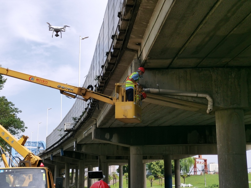 無人機巡查分隊通過無人機對隱患部位及周邊的梁板、橋墩情況進行了再次巡查,近距離進行了圖片采集,漢江三所通過對圖片進行分析和判斷,排除了其他隱患,并制定了應(yīng)急搶修方案,二分公司維修隊在接到維修任務(wù)后立即組織人員對落水管進行搶修。