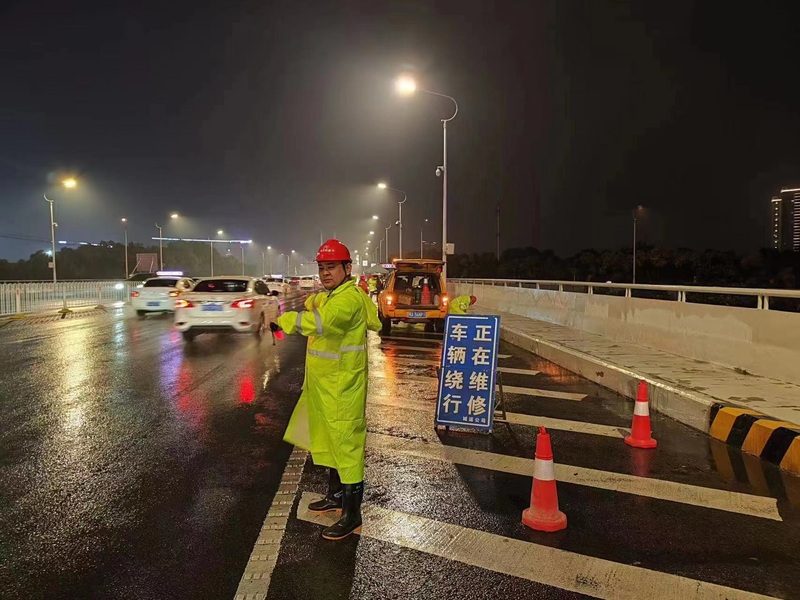 在抽排的同時(shí),當(dāng)班管護(hù)隊(duì)員夜巡期間,發(fā)現(xiàn)橋面23-27#(上、下游)燈桿處有較大面積漬水,立即用反光筒對(duì)漬水區(qū)域進(jìn)行封閉、打圍,安排專人在現(xiàn)場進(jìn)行交通疏導(dǎo),避免車輛駛?cè)氚l(fā)生交通事故,并利用抽水泵進(jìn)行快速抽排,直至橋面漬水消除。