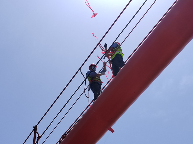 緊急情況下,鸚鵡洲長江大橋運維所立即啟動應(yīng)急預(yù)案,派遣管護隊員趕往現(xiàn)場處置。管護隊員到達現(xiàn)場后,穿戴好防護用品登上主纜的50米高處,清理懸掛在主纜上的風(fēng)箏。半個小時后順利取下纏繞在主纜上的風(fēng)箏,消除了安全隱患。