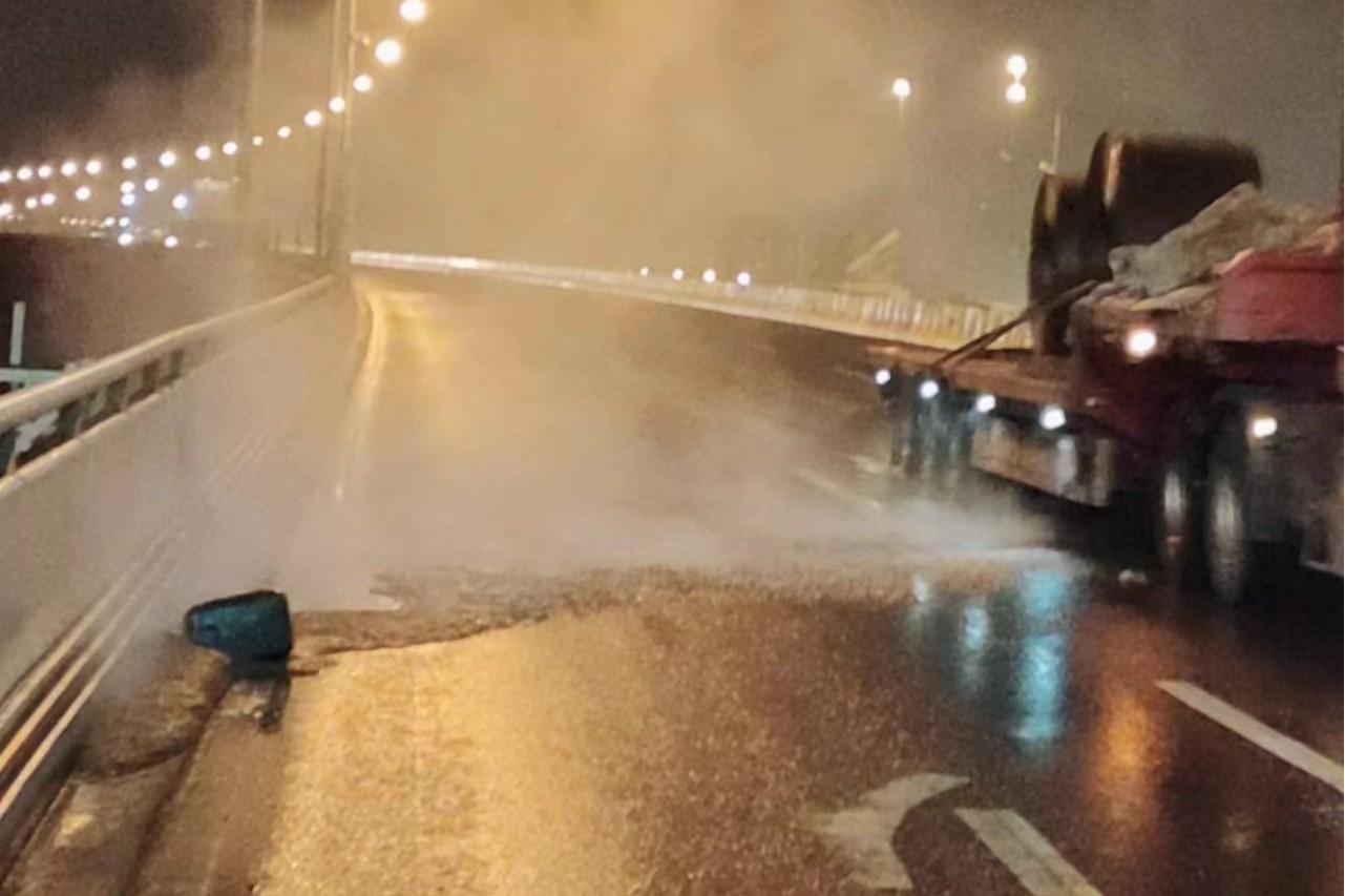 當(dāng)班管護隊員張孝武、江啟文看到現(xiàn)場情況后,立即啟動《?;沸孤锻话l(fā)事件應(yīng)急處置預(yù)案》,及時撥打119報警電話、并上報城運公司監(jiān)控中心及相關(guān)負(fù)責(zé)人,在現(xiàn)場用反光錐筒設(shè)置安全警示區(qū),提示過往車輛繞行。22:50分,青山消防大隊抵達(dá)現(xiàn)場,對橋面濃硫酸泄露區(qū)域進(jìn)行了專業(yè)處置,調(diào)配灑水車對泄露區(qū)域進(jìn)行反復(fù)沖洗,至23:20分橋梁?;沸孤┎课惶幹猛戤叄瑯蛎婊謴?fù)正常通行。