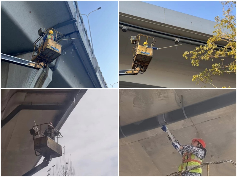項(xiàng)目運(yùn)維人員在日常巡查中密切關(guān)注,巡查4座高架橋項(xiàng)目,共發(fā)現(xiàn)約32處泄水管接頭處和伸縮縫與梁體下部結(jié)合部出現(xiàn)冰凌現(xiàn)象,危及橋下通行車(chē)輛和行人的安全。懸垂冰凌在不斷變大,除冰凌行動(dòng)迫在眉睫。運(yùn)維人員立即啟動(dòng)應(yīng)急措施,上下點(diǎn)對(duì)點(diǎn)擺放反光錐,以提醒過(guò)往行人和車(chē)輛注意安全,做好應(yīng)急防護(hù)后,除冰人員使用高架車(chē)登高開(kāi)展冰凌清除作業(yè),確保行人、車(chē)輛安全出行。