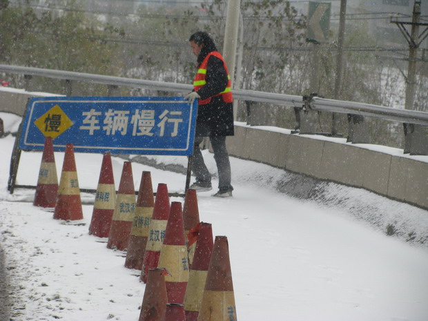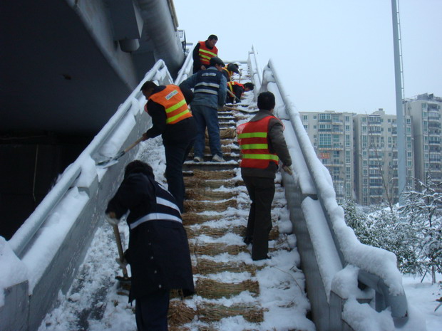 白沙洲大橋管理所在做好管轄路橋融雪防凍工作的同時,新增了15公里三環(huán)線東段和東南段工作任務(wù);天興洲大橋橋面為鋼箱梁結(jié)構(gòu),融雪難度大,為防止橋面結(jié)冰,備勤車輛同時出動,雙向撒融雪劑,確保了三環(huán)線全線道路安全暢通,未發(fā)生重大交通事故;市內(nèi)長江二橋、晴川橋、月湖橋,采取加強(qiáng)巡查,在橋梁彎道、匝道、坡路等重要路段設(shè)置觀察哨,并在人行階梯上鋪草袋。