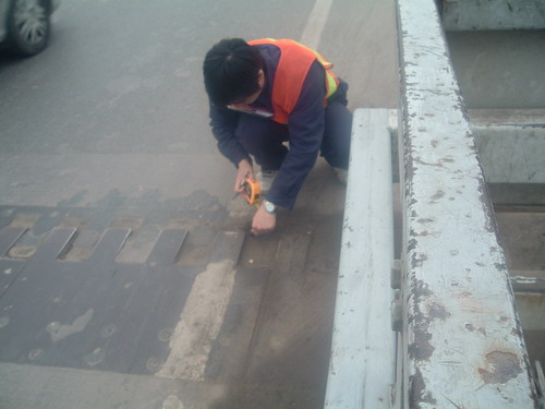 檢查前,所負(fù)責(zé)人召開崗前會,對當(dāng)日檢查項(xiàng)目逐一向參檢人員交待,重點(diǎn)布置檢查內(nèi)容;安全員部署檢查安全措施,明確參與人員安全職責(zé),強(qiáng)化安全檢查行為。檢查過程中,管護(hù)員在檢測員帶領(lǐng)下對全橋16條伸縮縫極限伸縮量進(jìn)行測量;對104個斜拉索下端鋼制護(hù)套外觀油漆完好、銹蝕、開裂和下錨頭附近混凝土的裂縫、剝落及防銹油脂進(jìn)行徹底檢查;對橋口段盆式橡膠支座的組件進(jìn)行清掃和檢查,并據(jù)實(shí)測量出支座位移量?,F(xiàn)場檢查工作完成后,檢測員對檢查所采集的數(shù)據(jù)與往年檢查數(shù)據(jù)進(jìn)行有效比對,對資料進(jìn)行系統(tǒng)化整理,擬定專項(xiàng)檢查報告,并進(jìn)行交流講評。