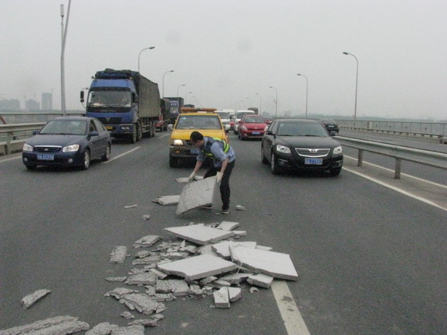 隊(duì)長(zhǎng)徐義虎迅速組織隊(duì)員趕赴現(xiàn)場(chǎng)。此時(shí),道路正中撒落的大量泡沫碎塊占據(jù)了一股半車道,足有200多平方米,現(xiàn)場(chǎng)交通滯留。隊(duì)員們迅速行動(dòng),一邊設(shè)置反光筒保障安全,一邊緊張地一趟又一趟地將路面拋撒物抱上巡路車的貨箱里。在隊(duì)員們的共同努力下,僅用了15分鐘就將道路清掃處理干凈。