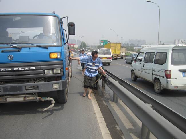 為使清洗工作不影響正常交通秩序,他們一邊有序組織車輛通行,一邊駕駛水車沖洗橋梁設(shè)施,隊員劉國斌和陳秋林光著赤腳,手持水槍頭,在前面用設(shè)施沖水,保潔員緊接其后,用勁抹洗灰塵污垢,汗水打濕衣襟,泥水濺滿全身,但橋梁設(shè)施得以恢復(fù)本色。
