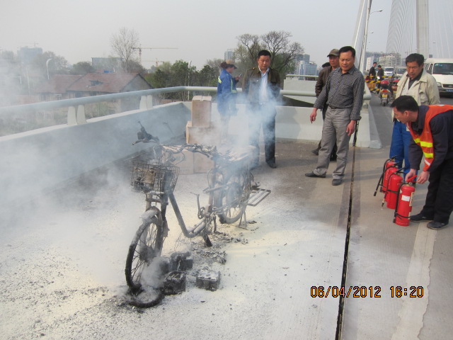 4月6日16時15分,月湖橋管理所監(jiān)控員報告:“橋面漢陽段上游匝道入口處附近有一輛助動車正在燃燒”。