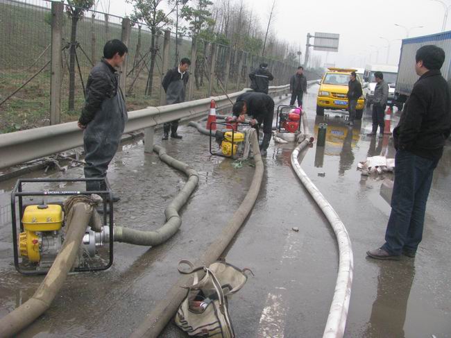 三環(huán)線北環(huán)古田二路段的排水方式為散排,但園林綠化施工后,該段綠化用地明顯高于路面,造成路面積水難以排出,一旦下雨就形成一片“汪?!?。對于管轄該路段的長豐橋管理所的隊員們,抽排道路漬水成了他們的重要工作。2月22日,武漢地區(qū)降中大雨,造成三環(huán)線北段古田二路段5處大面積漬水,過往車輛行駛存在嚴重安全隱患。長豐橋管理所隊員們抬機械、裝設(shè)備、穿下水衣,冒雨到漬水點進行抽排工作,累計排抽16個小時,抽排漬水4100立方米,確保了三環(huán)線道路的全線暢通。