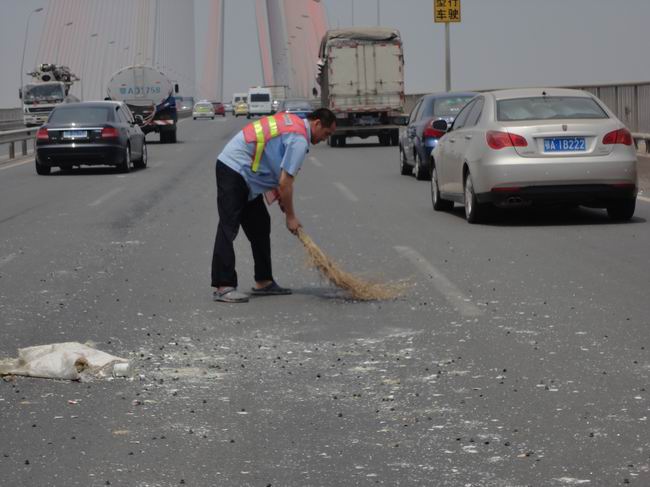 頂著中午的驕陽,隊員們看到散落在車道中的醫(yī)用玻璃碎渣占據(jù)著主要車道,給橋上正在行駛的車輛造成極大安全隱患。他們一邊疏通車道,指揮著車輛行駛,一邊組織隊員快速清除玻璃碎渣。經(jīng)過30分鐘的努力,終于將約10公斤,35平方米的玻璃碎渣清除干凈,保證了車道的安全暢通。