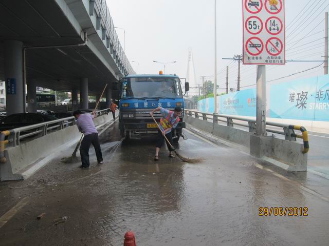 6月29日早晨,管理所管護(hù)員、漢陽(yáng)三公司清掃人員和灑水車按預(yù)期計(jì)劃到達(dá),管護(hù)員用反光筒和車輛將污染區(qū)域進(jìn)行隔離,為清掃人員打造安全作業(yè)環(huán)境;清掃人員和灑水車在管護(hù)員的指揮下,對(duì)漏撒的泥土沙石路面反復(fù)沖洗清掃。最后,通過(guò)管護(hù)員、清掃人員的共同努力奮戰(zhàn)近6小時(shí),橋面近2000平方米污染段基本清除干凈。