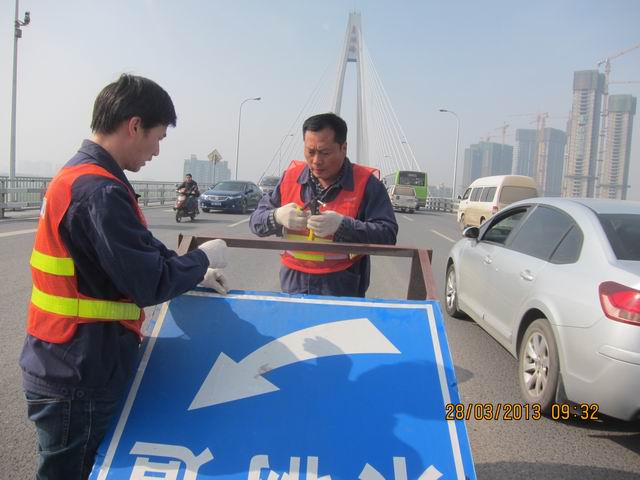 及時(shí)處置安全隱患 確保橋梁安全暢通。3月28日管護(hù)隊(duì)員巡查時(shí)發(fā)現(xiàn),放置在月湖橋正橋至硚口高架橋入口處的“限高3m 超高車輛請走匝道”的指示路牌,因大風(fēng)使連接面板與支架的鉚釘脫落,對過往的車輛造成安全隱患。管理所及時(shí)組織人員,對指示路牌脫落的鉚釘進(jìn)行加固,用鐵絲將面板與支架周邊重新固定,消除了安全隱患,確保了橋面行車的安全。