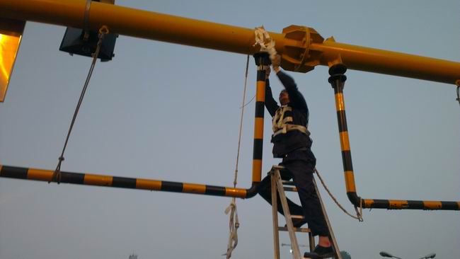 發(fā)現(xiàn)該類(lèi)情況后,當(dāng)班管護(hù)隊(duì)迅速用反光錐將事故車(chē)道封閉,防止次生事故的發(fā)生,留守橋面疏導(dǎo)過(guò)往車(chē)輛通行。組織人員利用升降梯、鐵絲、安全繩等簡(jiǎn)易器材,將撞損限高龍門(mén)架扶正,進(jìn)行了臨時(shí)加固處理,在橋面車(chē)流早高峰前搶修完畢,并及時(shí)清理了施工現(xiàn)場(chǎng)。