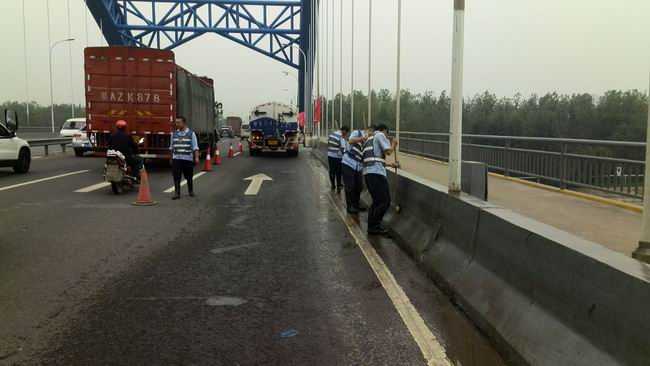 2013年環(huán)中國國際公路自行車賽武漢站途經(jīng)長豐橋,為迎接這項賽事,長豐橋管理所組織人員和車輛對長豐橋“洗臉”、“凈身”。