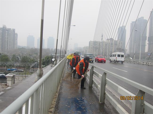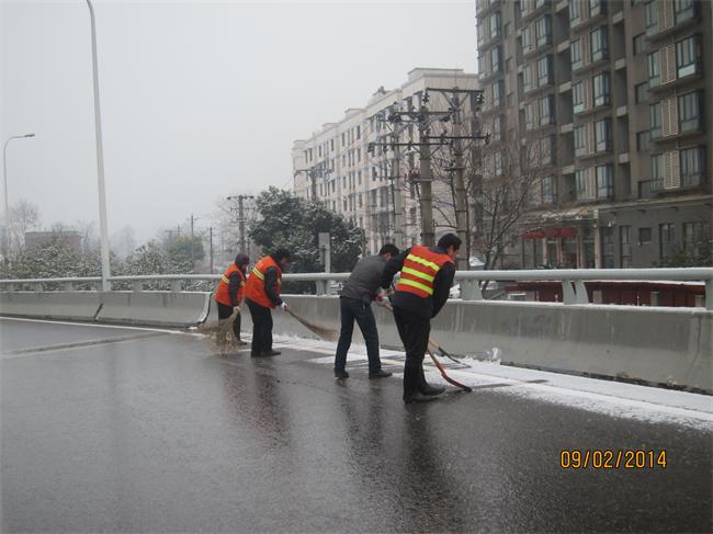 根據(jù)路橋中心橋梁融雪防凍預(yù)案的要求,所轄各橋梁管理所全體人員進(jìn)入警備狀態(tài),保持電話暢通,人員車(chē)輛做到隨叫隨到。當(dāng)班管護(hù)隊(duì)密切關(guān)注天氣情況,在原巡檢次數(shù)的基礎(chǔ)上,增加了對(duì)橋面路況的巡查次數(shù),對(duì)橋面坡道、匝道、人行梯道等重點(diǎn)路段進(jìn)行安全巡檢工作,并對(duì)融雪物資及橋面安全標(biāo)牌設(shè)施逐一進(jìn)行檢查,對(duì)橋面存在有積水、結(jié)冰的路段迅速組織人員進(jìn)行清掃和撒鹽化凍,確保道路通行安全。