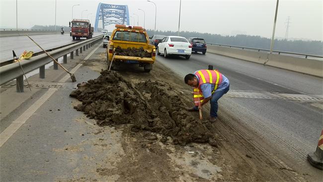 2014年9月25日6:00時,路橋中心長豐橋管理所監(jiān)控室發(fā)現(xiàn),長豐橋漢口向漢陽方向快車道突現(xiàn)約為200平方米“大土堆”,占據(jù)兩股車道,嚴重影響車輛通行。當班管護員立即趕到現(xiàn)場進行查看,原來“大土堆”是渣土車漏灑的泥土。眼看三環(huán)線車輛通行高峰即將到來,為保障車輛通行暢通,路橋中心長豐橋管護隊員迅速行動起來,按照突發(fā)拋灑事件應急處置預案,用反光錐將現(xiàn)場打圍、攜帶應急鐵鍬,駕駛車輛對“大土堆”進行了緊急清理。6:25分,當2臺垃圾清運車將約20立方米渣土運走,交通恢復了正常。