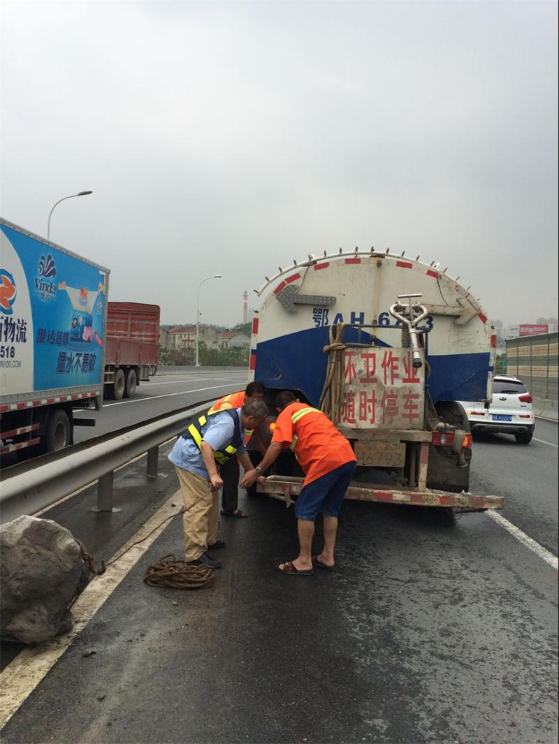 見此情況,江漢橋梁管理二所立即啟動(dòng)《道路突發(fā)漏灑事故專項(xiàng)處置預(yù)案》,緊急聯(lián)系保潔公司,要求對(duì)方立即派環(huán)衛(wèi)車趕赴現(xiàn)場,同時(shí)指派專人趕赴現(xiàn)場疏導(dǎo)交通。30分鐘后保潔公司趕到現(xiàn)場后,管護(hù)隊(duì)員用鋼纜將巨石固定,再由環(huán)衛(wèi)清掃車將巨石拖離橋面,在較短的時(shí)間內(nèi)恢復(fù)了車輛正常通行。