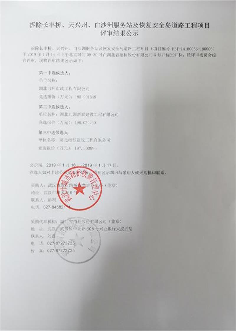 拆除長豐橋、天興洲、白沙洲服務(wù)站及恢復(fù)安全島道路工程項(xiàng)目評(píng)審結(jié)果的公示