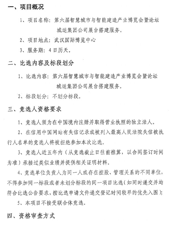 第六屆智慧城市與智能建造產(chǎn)業(yè)博覽會(huì)暨論壇城運(yùn)集團(tuán)公司展臺(tái)搭建服務(wù)比選公告